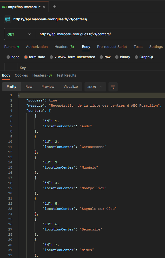 L'identifiant «centers» qui correspond à ce qui a été saisi, permet de les lister.